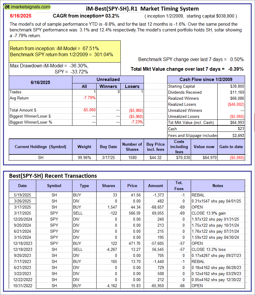 iM-Best(SPY-SH).R1: The model’s out of sample performance YTD is -9.8%, and for the last 12 months is -1.6%. Over the same period the benchmark SPY performance was 3.1% and 12.4% respectively. Over the previous week the market value of Best(SPY-SH) gained -0.39% at a time when SPY gained 0.50%. A starting capital of $100,000 at inception on 1/2/2009 would have grown to $64,993 which includes $23 cash and excludes $2,692 spent on fees and slippage. |