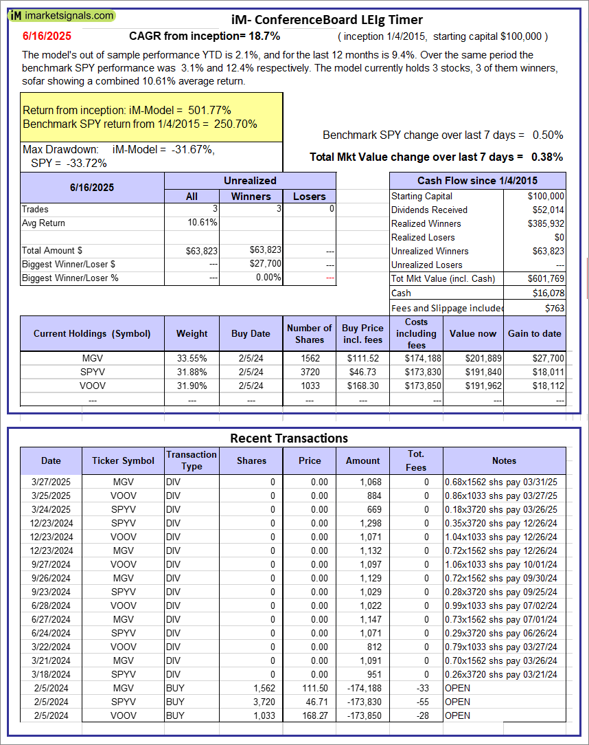 iM-Conference Board LEIg Timer: The model’s performance YTD is 14.3%, and for the last 12 months is 7.3%. Over the same period the benchmark SPY performance was 20.1% and 9.4% respectively. Over the previous week the market value of the iM-Conference Board LEIg Timer gained 0.38% at a time when SPY gained 0.50%. A starting capital of $100,000 at inception on 4/5/2017 would have grown to $601,769 which includes $16,078 cash and excludes $763 spent on fees and slippage. |
