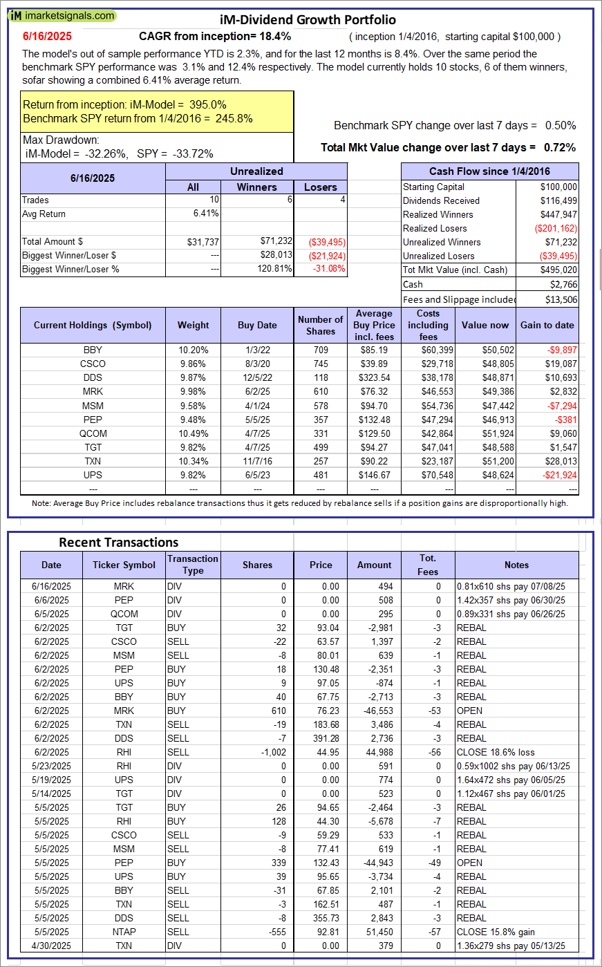 iM-Dividend Growth Portfolio: The model’s out of sample performance YTD is 2.3%, and for the last 12 months is 8.4%. Over the same period the benchmark SPY performance was 3.1% and 12.4% respectively. Over the previous week the market value of the iM-Dividend Growth Portfolio gained 0.72% at a time when SPY gained 0.50%. A starting capital of $100,000 at inception on 6/30/2016 would have grown to $495,020 which includes $2,766 cash and excludes $13,506 spent on fees and slippage. |