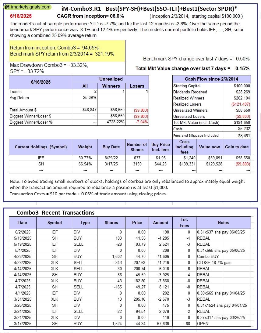 iM-Combo3.R1: The model’s out of sample performance YTD is -7.7%, and for the last 12 months is -3.8%. Over the same period the benchmark SPY performance was 3.1% and 12.4% respectively. Over the previous week the market value of iM-Combo3.R1 gained -0.15% at a time when SPY gained 0.50%. A starting capital of $100,000 at inception on 2/3/2014 would have grown to $194,650 which includes $5,232 cash and excludes $8,451 spent on fees and slippage. |
