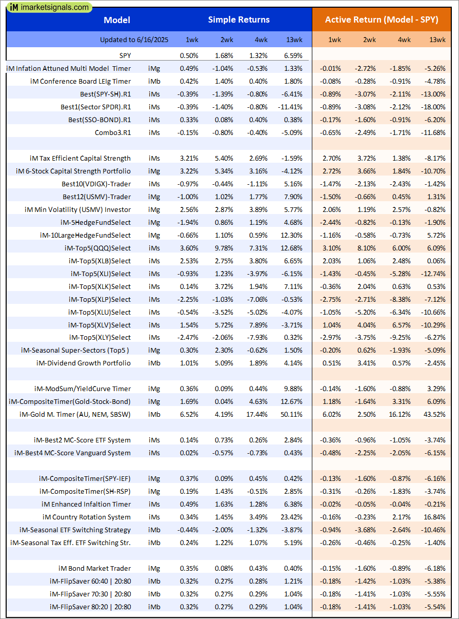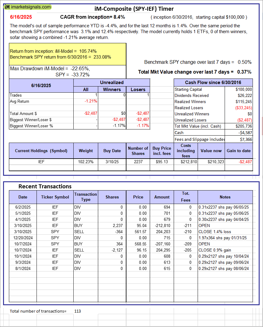 iM-Composite (SPY-IEF) Timer: The model’s out of sample performance YTD is -4.4%, and for the last 12 months is 1.4%. Over the same period the benchmark SPY performance was 3.1% and 12.4% respectively. Over the previous week the market value of the iM-Composite (SPY-IEF) Timer gained 0.37% at a time when SPY gained 0.50%. A starting capital of $100,000 at inception on 6/30/2016 would have grown to $205,736 which includes -$4,587 cash and excludes $7,366 spent on fees and slippage. |