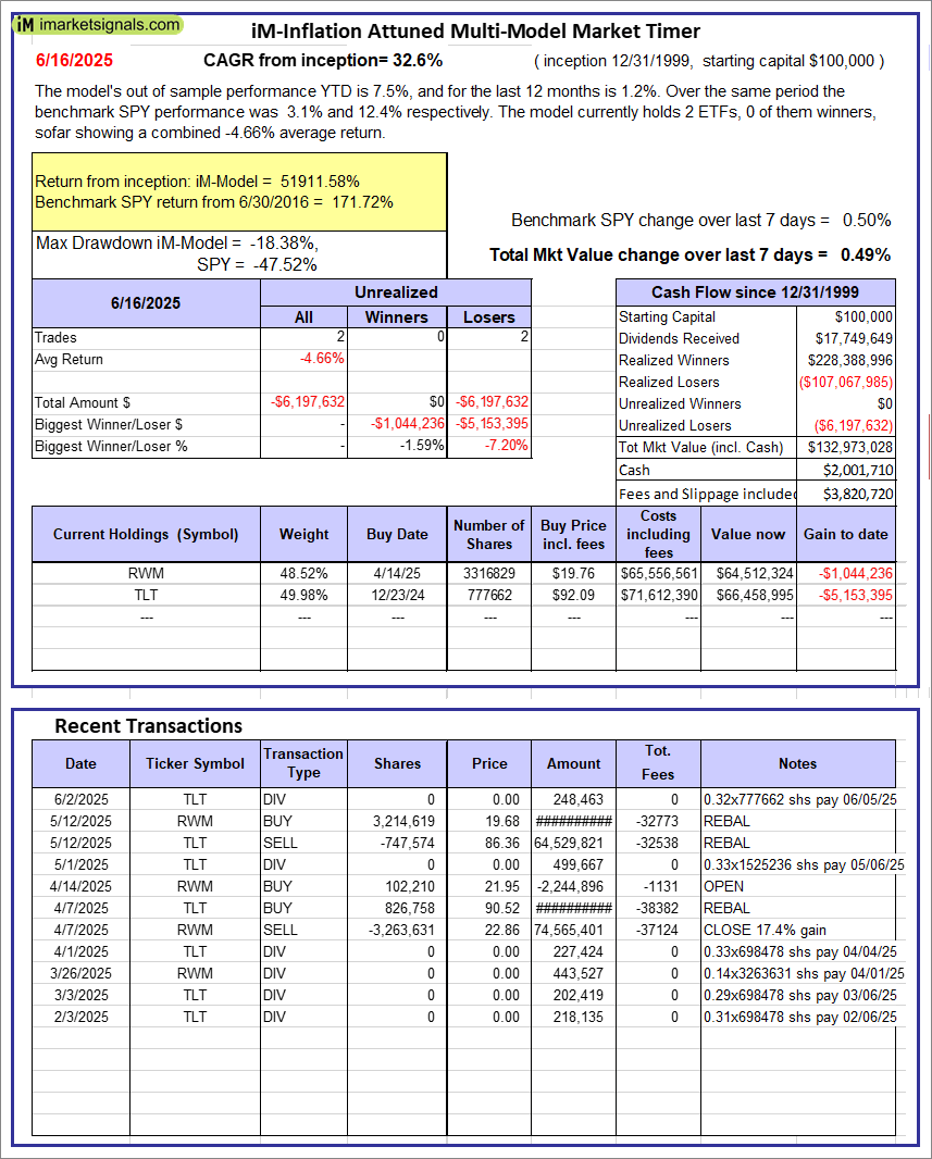 iM-Inflation Attuned Multi-Model Market Timer: The model’s out of sample performance YTD is 7.5%, and for the last 12 months is 1.2%. Over the same period the benchmark SPY performance was 3.1% and 12.4% respectively. Over the previous week the market value of the iM-Inflation Attuned Multi-Model Market Timer gained 0.49% at a time when SPY gained 0.50%. A starting capital of $100,000 at inception on 3/24/2017 would have grown to $132,973,028 which includes $2,001,710 cash and excludes $3,820,720 spent on fees and slippage. |