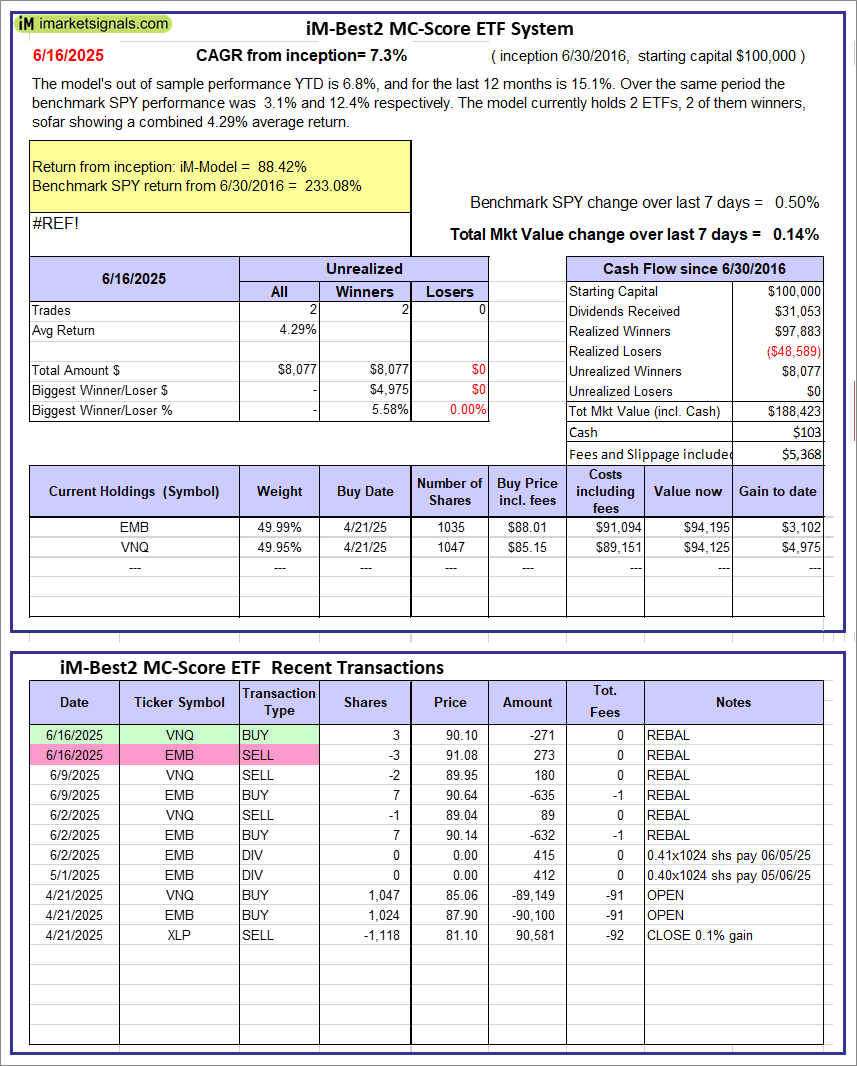 iM-Best2 MC-Score ETF System: The model’s out of sample performance YTD is 6.8%, and for the last 12 months is 15.1%. Over the same period the benchmark SPY performance was 3.1% and 12.4% respectively. Over the previous week the market value of the iM-Best2 MC-Score ETF System gained 0.14% at a time when SPY gained 0.50%. A starting capital of $100,000 at inception on 6/30/2016 would have grown to $188,423 which includes $103 cash and excludes $5,368 spent on fees and slippage. |