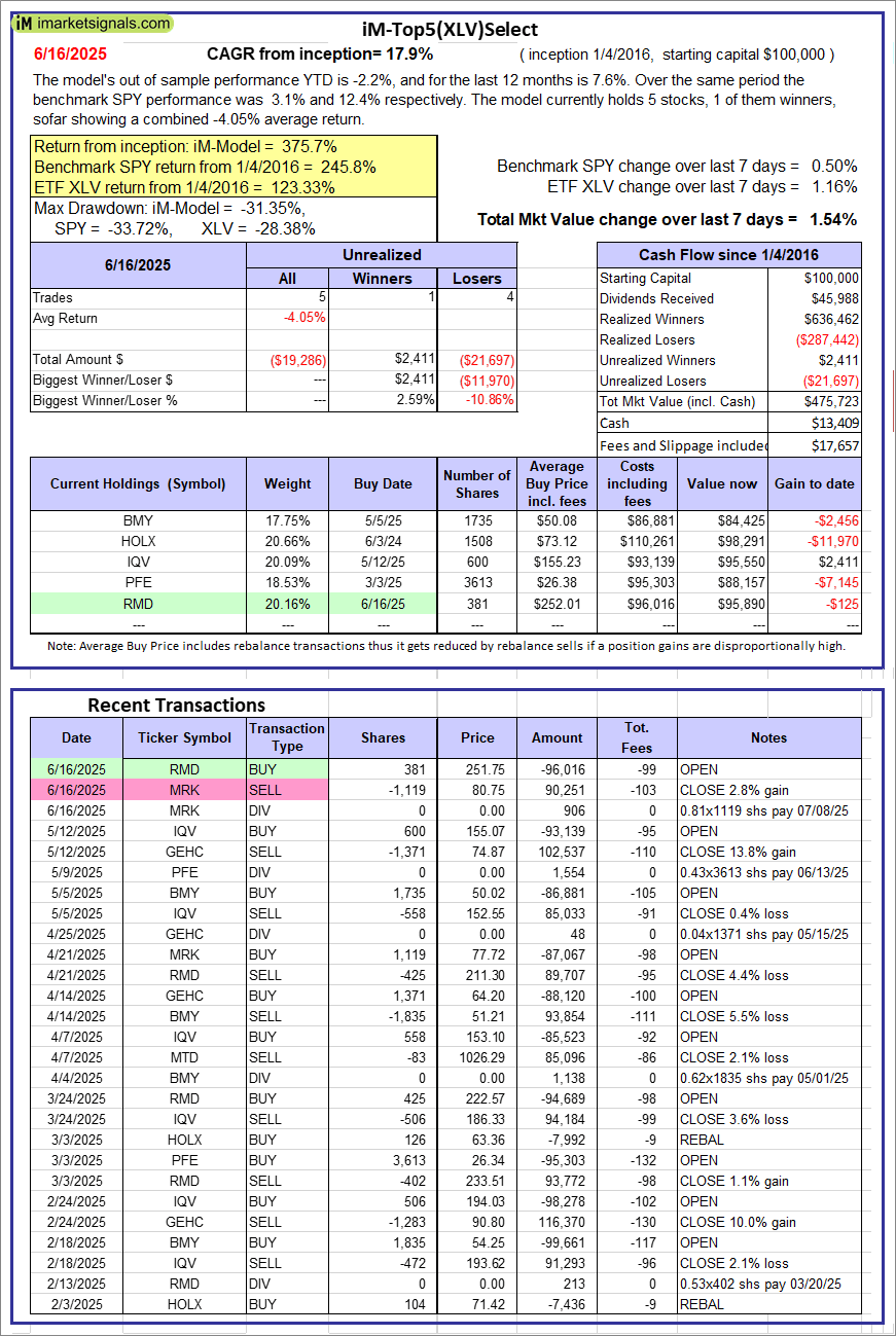 iM-Top5(XLV)Select: Since inception, on 1/5/2016, the model gained 375.72% while the benchmark SPY gained 245.79% over the same period. Over the previous week the market value of iM-Top5(XLV)Select gained 1.54% at a time when SPY gained 0.50%. A starting capital of $100,000 at inception on 1/5/2016 would have grown to $475,723 which includes $13,409 cash and excludes $17,657 spent on fees and slippage. |