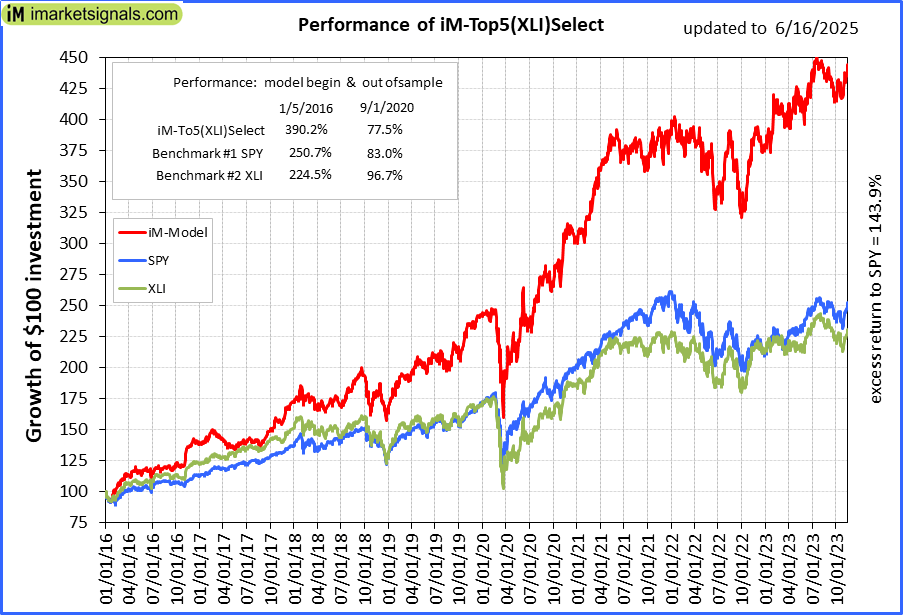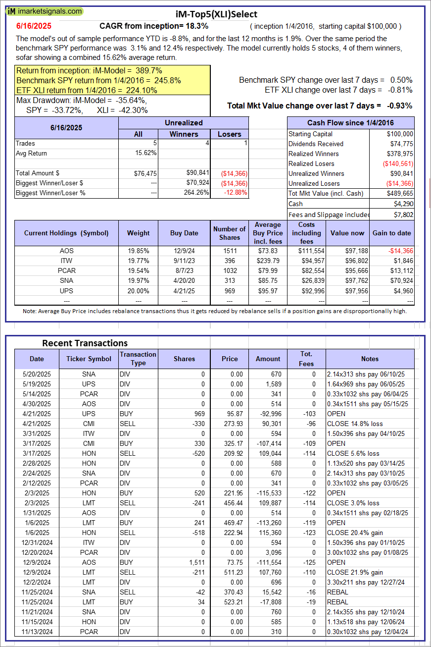 iM-Top5(XLI)Select: Since inception, on 1/5/2016, the model gained 389.66% while the benchmark SPY gained 245.79% over the same period. Over the previous week the market value of iM-Top5(XLI)Select gained -0.93% at a time when SPY gained 0.50%. A starting capital of $100,000 at inception on 1/5/2016 would have grown to $489,665 which includes $4,290 cash and excludes $7,802 spent on fees and slippage. |
