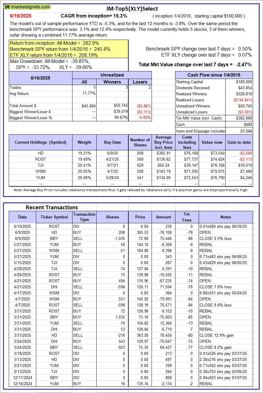 iM-Top5(XLY)Select: Since inception, on 1/5/2016, the model gained 282.89% while the benchmark SPY gained 245.79% over the same period. Over the previous week the market value of iM-Top5(XLY)Select gained -2.47% at a time when SPY gained 0.50%. A starting capital of $100,000 at inception on 1/5/2016 would have grown to $382,888 which includes $692 cash and excludes $7,566 spent on fees and slippage. |