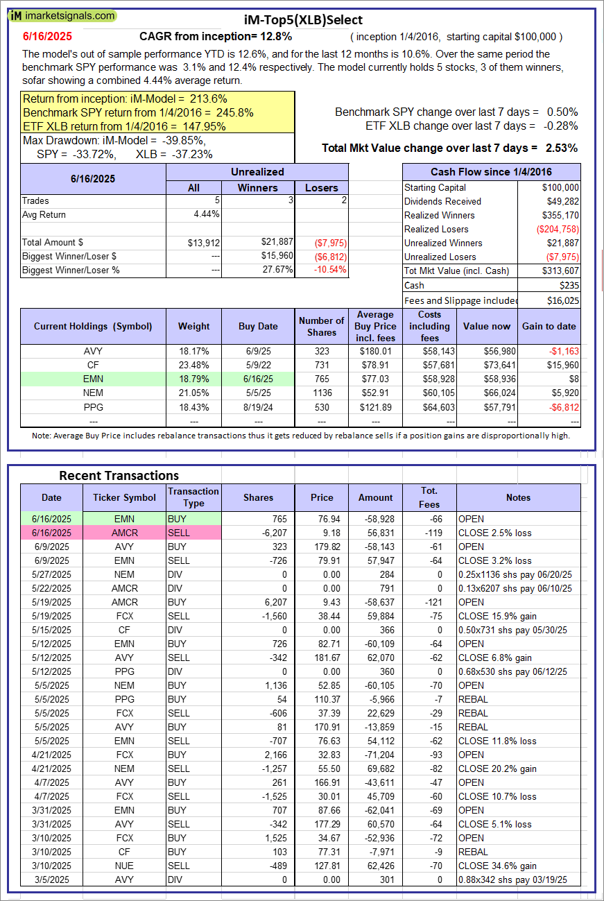 iM-Top5(XLB)Select: Since inception, on 1/5/2016, the model gained 213.61% while the benchmark SPY gained 245.79% over the same period. Over the previous week the market value of iM-Top5(XLB)Select gained 2.53% at a time when SPY gained 0.50%. A starting capital of $100,000 at inception on 1/5/2016 would have grown to $313,607 which includes $235 cash and excludes $16,025 spent on fees and slippage. |
