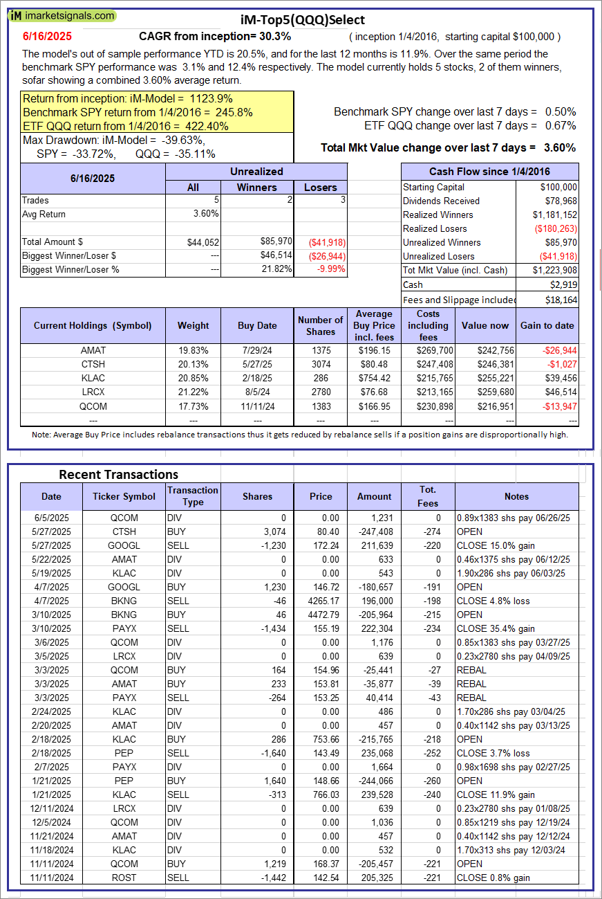 iM-Top5(QQQ)Select: Since inception, on 1/5/2016, the model gained 1123.91% while the benchmark SPY gained 245.79% over the same period. Over the previous week the market value of iM-Top5(QQQ)Select gained 3.60% at a time when SPY gained 0.50%. A starting capital of $100,000 at inception on 1/5/2016 would have grown to $1,223,908 which includes $2,919 cash and excludes $18,164 spent on fees and slippage. |