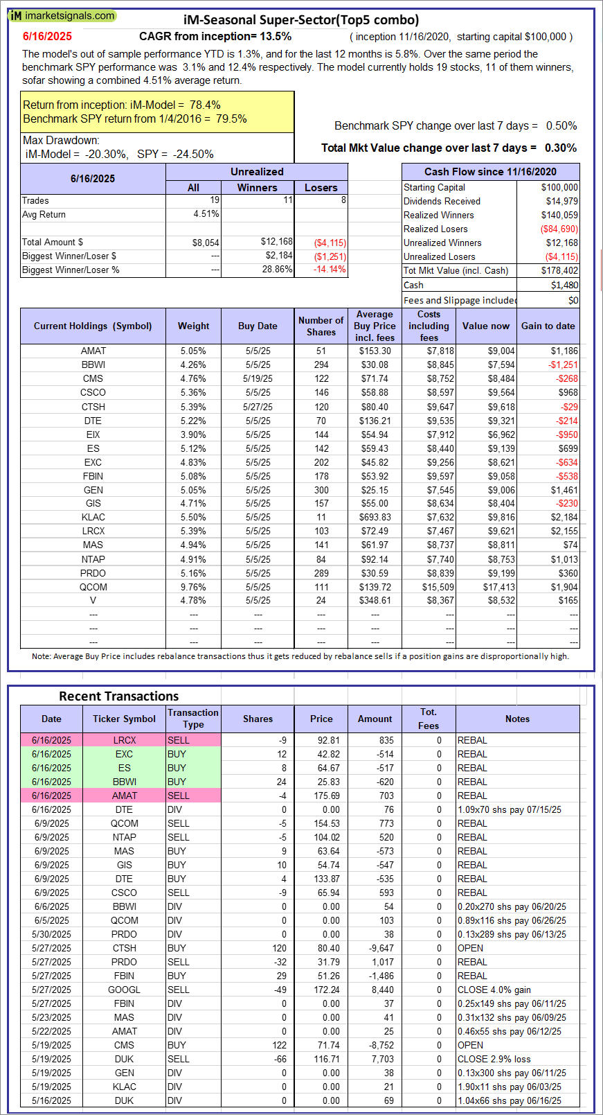 iM-Seasonal Super-Sectors (Top5 combo) : Since inception, on 11/17/2020, the model gained 78.40% while the benchmark SPY gained 79.50% over the same period. Over the previous week the market value of iM-Seasonal Super-Sectors (Top5 combo) gained 0.30% at a time when SPY gained 0.50%. A starting capital of $100,000 at inception on 11/17/2020 would have grown to $178,402 which includes $1,480 cash and excludes $00 spent on fees and slippage. |