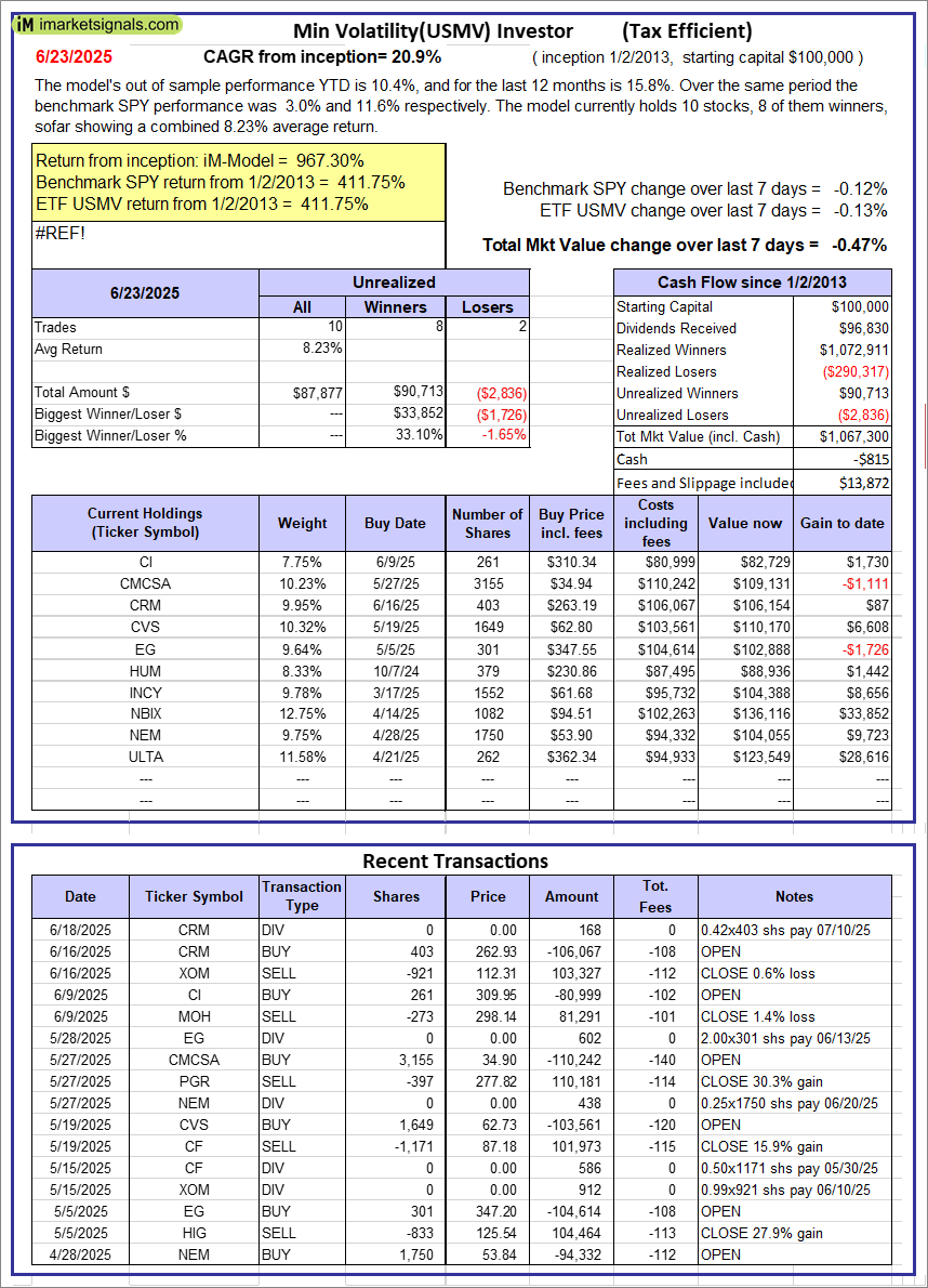 iM-Min Volatility(USMV) Investor (Tax Efficient): The model’s out of sample performance YTD is 10.4%, and for the last 12 months is 15.8%. Over the same period the benchmark SPY performance was 3.0% and 11.6% respectively. Since inception, on 1/3/2013, the model gained 967.30% while the benchmark SPY gained 411.75% and the ETF USMV gained 411.75% over the same period. Over the previous week the market value of iM-Best12(USMV)Q1 gained -0.47% at a time when SPY gained -0.12%. A starting capital of $100,000 at inception on 1/3/2013 would have grown to $1,067,300 which includes -$815 cash and excludes $13,872 spent on fees and slippage. |