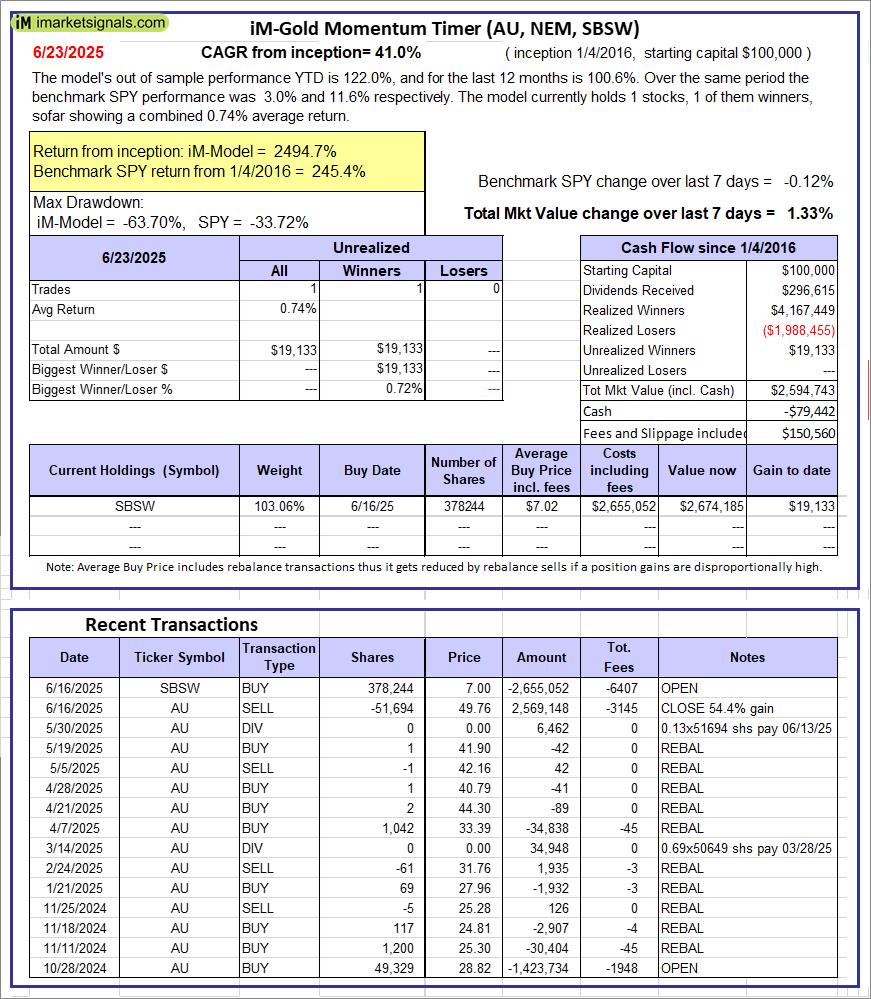iM-Gold Momentum Timer (AU, NEM, SBSW): The model’s out of sample performance YTD is 122.0%, and for the last 12 months is 100.6%. Over the same period the benchmark SPY performance was 3.0% and 11.6% respectively. Over the previous week the market value of iM-Gold Momentum Timer (AU, NEM, SBSW) gained 1.33% at a time when SPY gained -0.12%. A starting capital of $100,000 at inception on 6/30/2016 would have grown to -$79,442 which includes $150,560 cash and excludes Gain to date spent on fees and slippage. |
