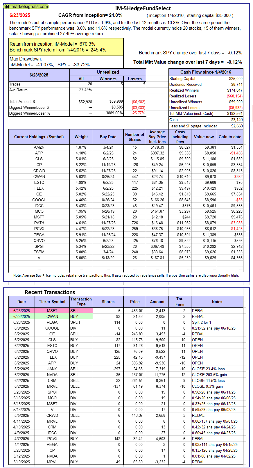 iM-5HedgeFundSelect: Since inception, on 1/5/2016, the model gained 670.25% while the benchmark SPY gained 245.35% over the same period. Over the previous week the market value of iM-5HedgeFundSelect gained -0.12% at a time when SPY gained -0.12%. A starting capital of $25,000 at inception on 1/5/2016 would have grown to $192,561 which includes -$3,140 cash and excludes $2,660 spent on fees and slippage. |