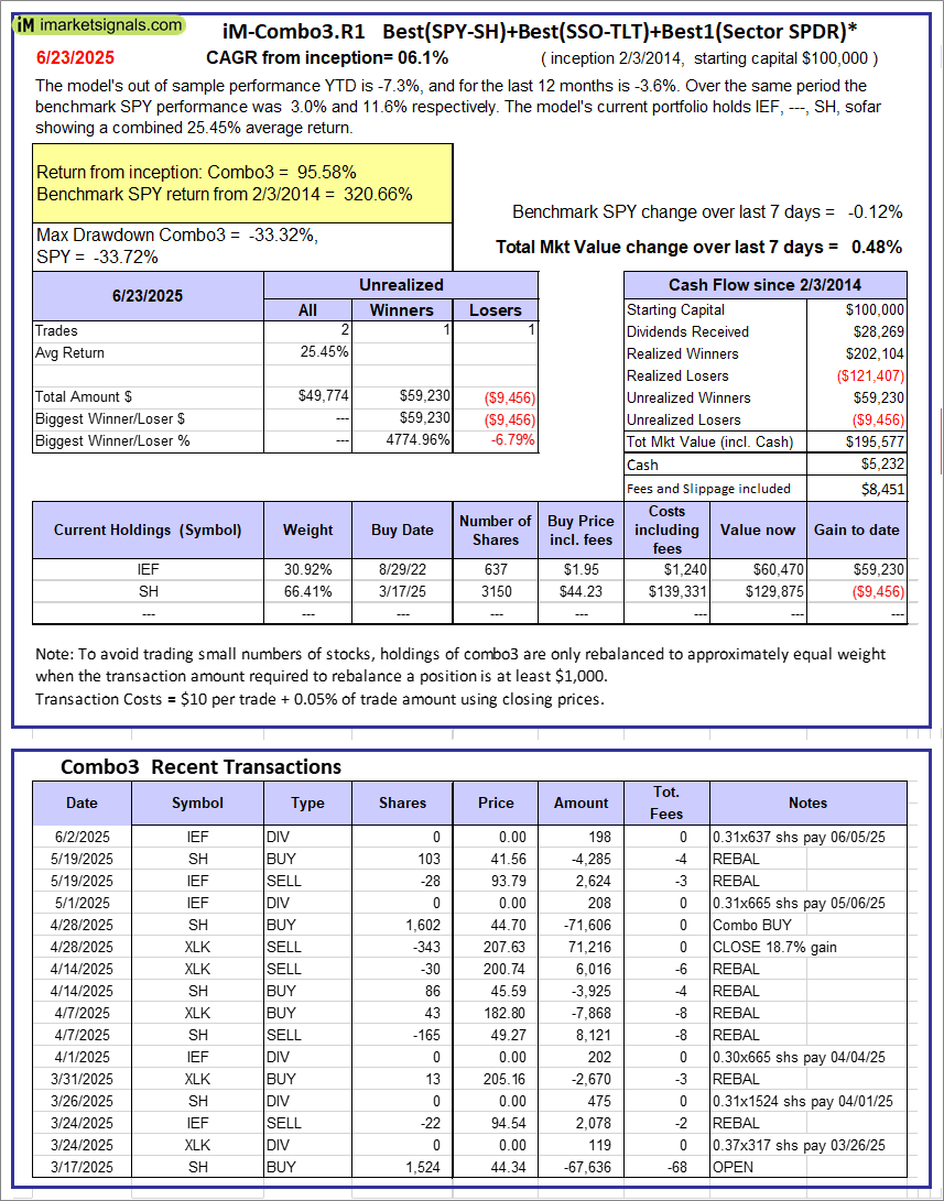 iM-Combo3.R1: The model’s out of sample performance YTD is -7.3%, and for the last 12 months is -3.6%. Over the same period the benchmark SPY performance was 3.0% and 11.6% respectively. Over the previous week the market value of iM-Combo3.R1 gained 0.48% at a time when SPY gained -0.12%. A starting capital of $100,000 at inception on 2/3/2014 would have grown to $195,577 which includes $5,232 cash and excludes $8,451 spent on fees and slippage. |