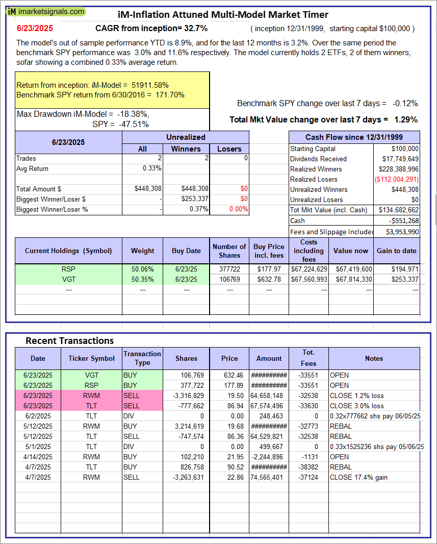 iM-Inflation Attuned Multi-Model Market Timer: The model’s out of sample performance YTD is 8.9%, and for the last 12 months is 3.2%. Over the same period the benchmark SPY performance was 3.0% and 11.6% respectively. Over the previous week the market value of the iM-Inflation Attuned Multi-Model Market Timer gained 1.29% at a time when SPY gained -0.12%. A starting capital of $100,000 at inception on 3/24/2017 would have grown to $134,682,662 which includes -$551,268 cash and excludes $3,953,990 spent on fees and slippage. |