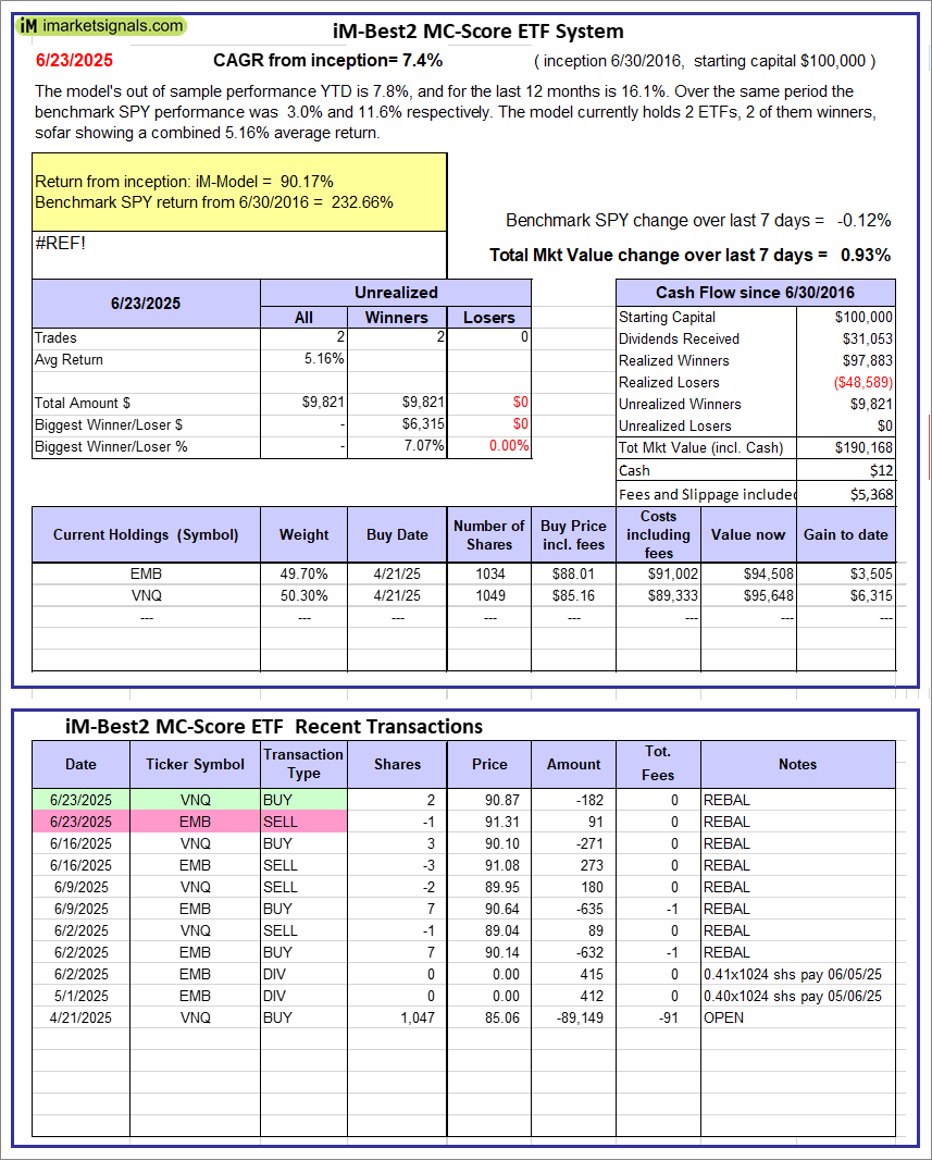 iM-Best2 MC-Score ETF System: The model’s out of sample performance YTD is 7.8%, and for the last 12 months is 16.1%. Over the same period the benchmark SPY performance was 3.0% and 11.6% respectively. Over the previous week the market value of the iM-Best2 MC-Score ETF System gained 0.93% at a time when SPY gained -0.12%. A starting capital of $100,000 at inception on 6/30/2016 would have grown to $190,168 which includes $12 cash and excludes $5,368 spent on fees and slippage. |