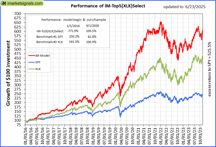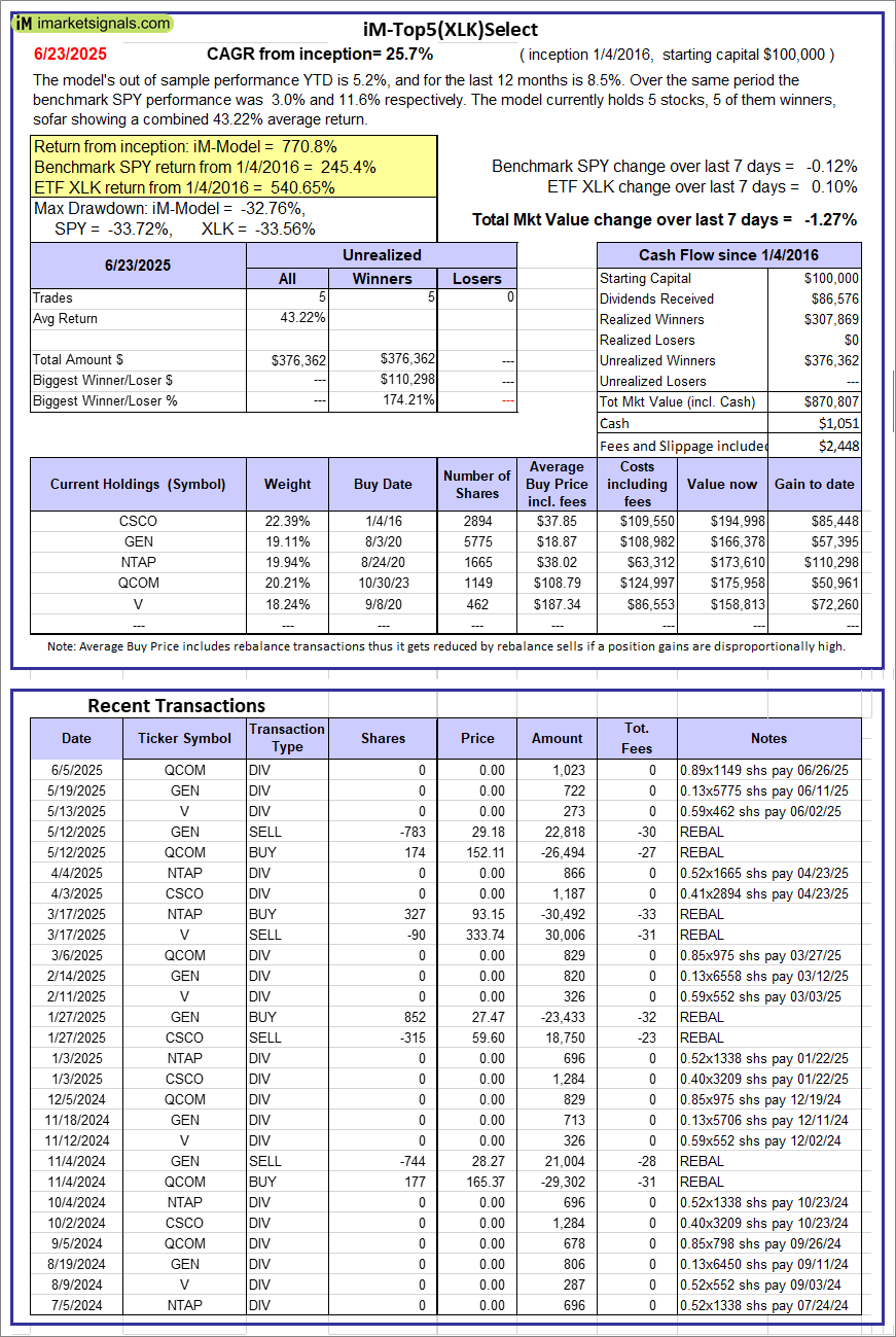 iM-Top5(XLK)Select: Since inception, on 1/5/2016, the model gained 770.81% while the benchmark SPY gained 245.35% over the same period. Over the previous week the market value of iM-Top5(XLK)Select gained -1.27% at a time when SPY gained -0.12%. A starting capital of $100,000 at inception on 1/5/2016 would have grown to $870,807 which includes $1,051 cash and excludes $2,448 spent on fees and slippage. |