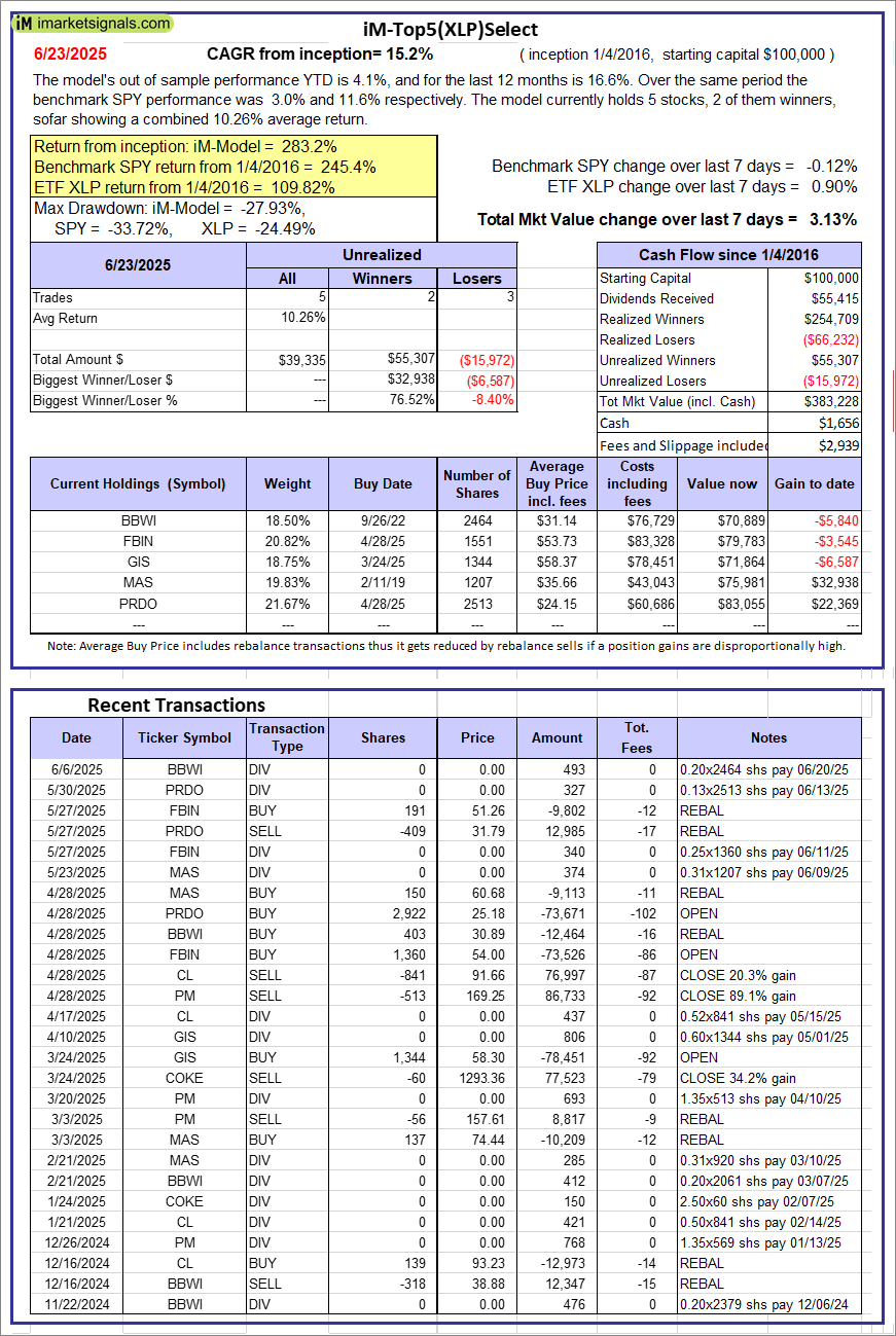 iM-Top5(XLP)Select: Since inception, on 1/5/2016, the model gained 283.23% while the benchmark SPY gained 245.35% over the same period. Over the previous week the market value of iM-Top5(XLP)Select gained 3.13% at a time when SPY gained -0.12%. A starting capital of $100,000 at inception on 1/5/2016 would have grown to $383,228 which includes $1,656 cash and excludes $2,939 spent on fees and slippage. |