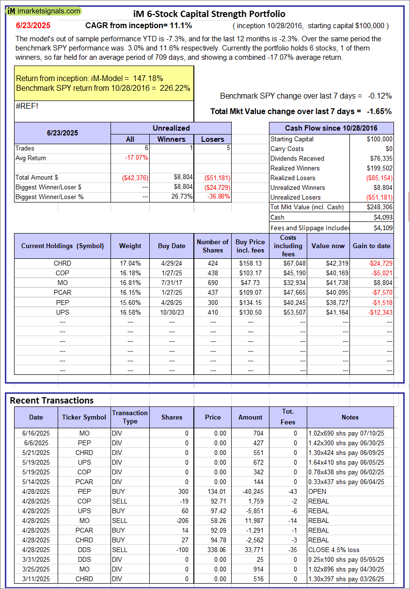 iM 6-Stock Capital Strength Portfolio: The model’s out of sample performance YTD is -7.3%, and for the last 12 months is -2.3%. Over the same period the benchmark SPY performance was 3.0% and 11.6% respectively. Over the previous week the market value of the iM 6-Stock Capital Strength Portfolio gained -1.65% at a time when SPY gained -0.12%. A starting capital of $100,000 at inception on 10/28/2016 would have grown to $248,306 which includes $4,093 cash and excludes $4,109 spent on fees and slippage. |