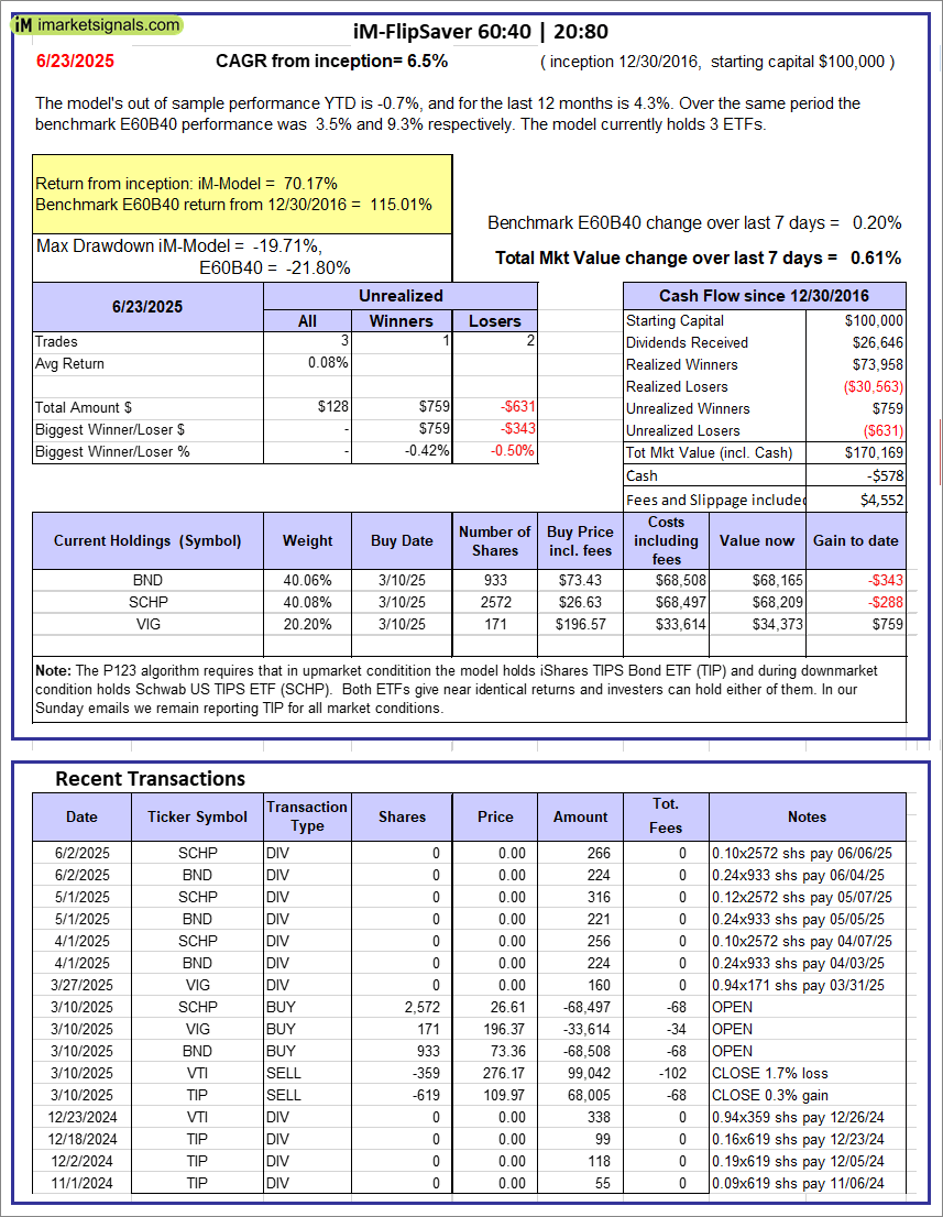 iM-Composite(Gold-Stocks-Bond) Timer: The model’s out of sample performance YTD is 28.5%, and for the last 12 months is 44.9%. Over the same period the benchmark SPY performance was 3.0% and 11.6% respectively. Over the previous week the market value of the iM-Composite(Gold-Stocks-Bond) Timer gained -0.21% at a time when SPY gained -0.12%. A starting capital of $100,000 at inception on 6/30/2016 would have grown to $316,858 which includes $36 cash and excludes $9,190 spent on fees and slippage. |