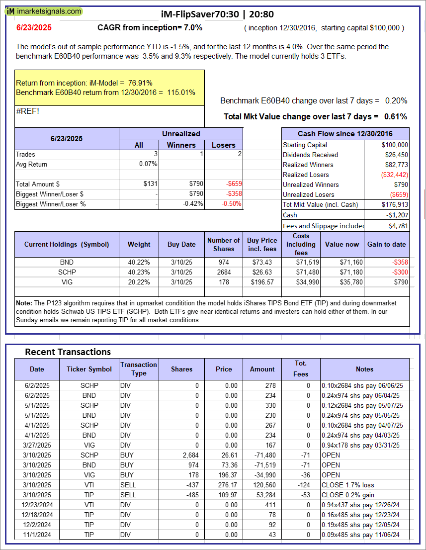 iM-FlipSaver 70:30 | 20:80 – 2017: The model’s out of sample performance YTD is -1.5%, and for the last 12 months is 4.0%. Over the same period the benchmark E60B40 performance was 3.5% and 9.3% respectively. Over the previous week the market value of iM-FlipSaver 70:30 | 20:80 gained 0.61% at a time when SPY gained 0.20%. A starting capital of $100,000 at inception on 7/15/2015 would have grown to $176,913 which includes -$1,207 cash and excludes $4,781 spent on fees and slippage. |