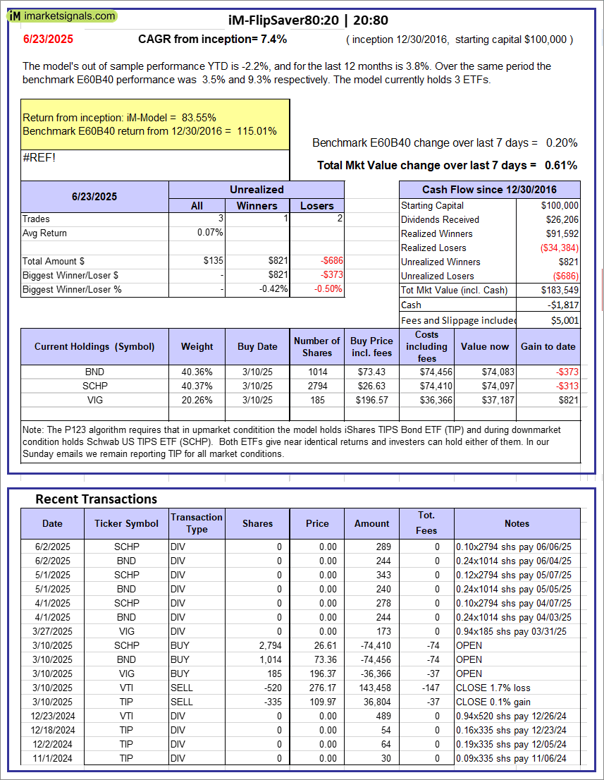 iM-FlipSaver 80:20 | 20:80 – 2017: The model’s out of sample performance YTD is -2.2%, and for the last 12 months is 3.8%. Over the same period the benchmark E60B40 performance was 3.5% and 9.3% respectively. Over the previous week the market value of iM-FlipSaver 80:20 | 20:80 gained 0.61% at a time when SPY gained 0.20%. A starting capital of $100,000 at inception on 1/2/2017 would have grown to $183,549 which includes -$1,817 cash and excludes $5,001 spent on fees and slippage. |