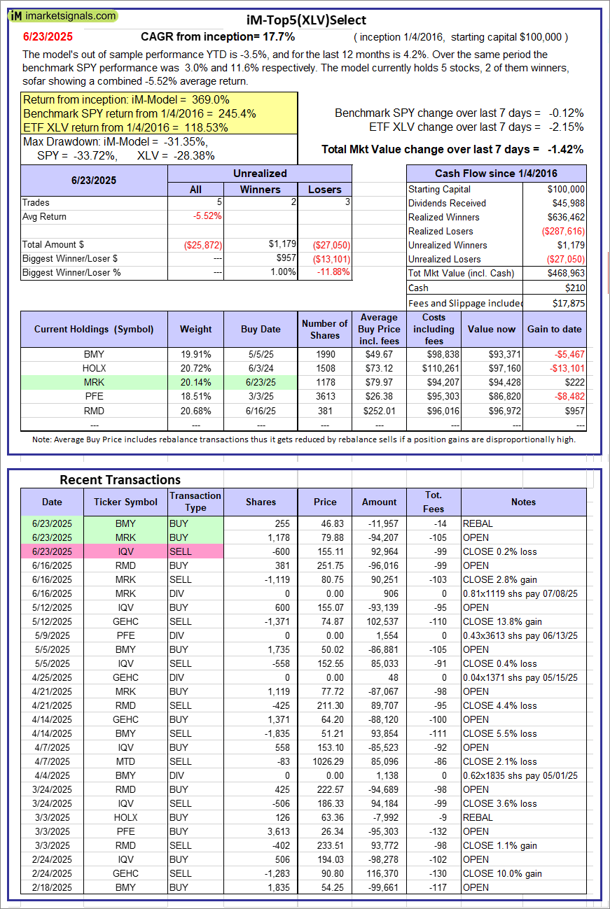 iM-Top5(XLV)Select: Since inception, on 1/5/2016, the model gained 368.96% while the benchmark SPY gained 245.35% over the same period. Over the previous week the market value of iM-Top5(XLV)Select gained -1.42% at a time when SPY gained -0.12%. A starting capital of $100,000 at inception on 1/5/2016 would have grown to $468,963 which includes $210 cash and excludes $17,875 spent on fees and slippage. |