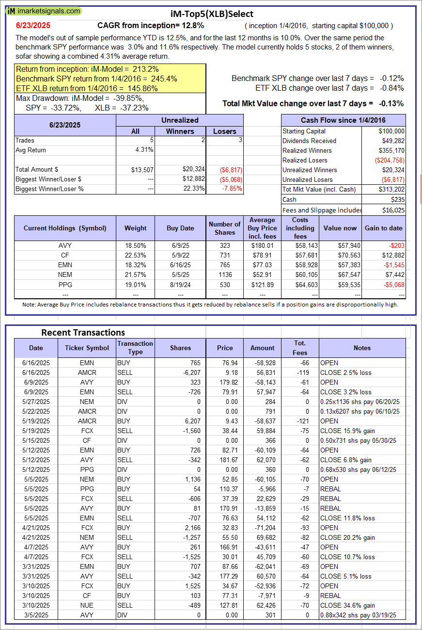 iM-Top5(XLB)Select: Since inception, on 1/5/2016, the model gained 213.20% while the benchmark SPY gained 245.35% over the same period. Over the previous week the market value of iM-Top5(XLB)Select gained -0.13% at a time when SPY gained -0.12%. A starting capital of $100,000 at inception on 1/5/2016 would have grown to $313,202 which includes $235 cash and excludes $16,025 spent on fees and slippage. |