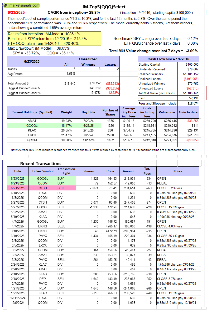 iM-Top5(QQQ)Select: Since inception, on 1/5/2016, the model gained 1086.14% while the benchmark SPY gained 245.35% over the same period. Over the previous week the market value of iM-Top5(QQQ)Select gained -3.09% at a time when SPY gained -0.12%. A starting capital of $100,000 at inception on 1/5/2016 would have grown to $1,186,141 which includes $7,191 cash and excludes $18,674 spent on fees and slippage. |