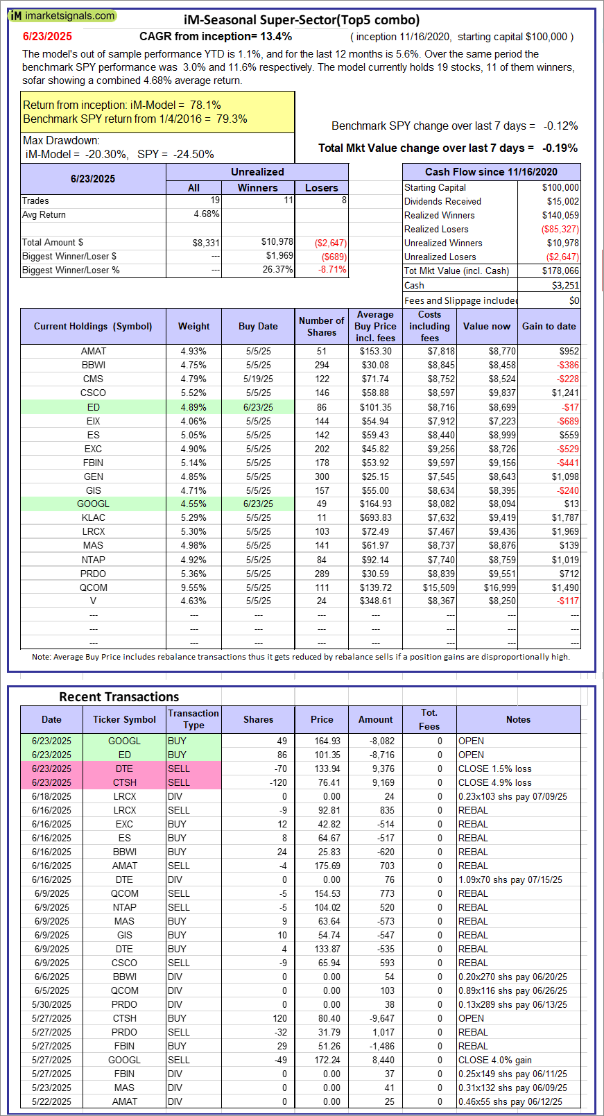 iM-Seasonal Super-Sectors (Top5 combo) : Since inception, on 11/17/2020, the model gained 78.07% while the benchmark SPY gained 79.27% over the same period. Over the previous week the market value of iM-Seasonal Super-Sectors (Top5 combo) gained -0.19% at a time when SPY gained -0.12%. A starting capital of $100,000 at inception on 11/17/2020 would have grown to $178,066 which includes $3,251 cash and excludes $00 spent on fees and slippage. |