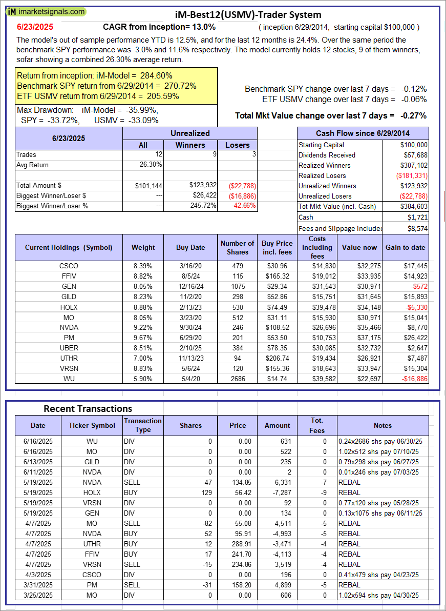 iM-Best12(USMV)-Trader: The model’s out of sample performance YTD is 12.5%, and for the last 12 months is 24.4%. Over the same period the benchmark SPY performance was 3.0% and 11.6% respectively. Since inception, on 6/30/2014, the model gained 284.60% while the benchmark SPY gained 270.72% and the ETF USMV gained 205.59% over the same period. Over the previous week the market value of iM-Best12(USMV)-Trader gained -0.27% at a time when SPY gained -0.12%. A starting capital of $100,000 at inception on 6/30/2014 would have grown to $384,603 which includes $1,721 cash and excludes $8,574 spent on fees and slippage. |