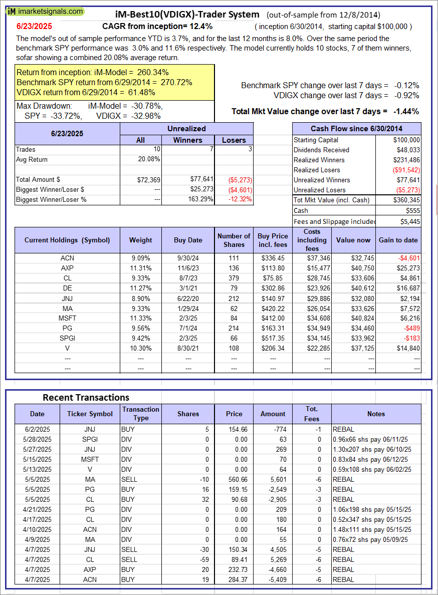 iM-Best10(VDIGX)-Trader: The model’s out of sample performance YTD is 3.7%, and for the last 12 months is 8.0%. Over the same period the benchmark SPY performance was 3.0% and 11.6% respectively. Since inception, on 7/1/2014, the model gained 260.34% while the benchmark SPY gained 270.72% and VDIGX gained 61.48% over the same period. Over the previous week the market value of iM-Best10(VDIGX) gained -1.44% at a time when SPY gained -0.12%. A starting capital of $100,000 at inception on 7/1/2014 would have grown to $360,345 which includes $555 cash and excludes $5,445 spent on fees and slippage. |