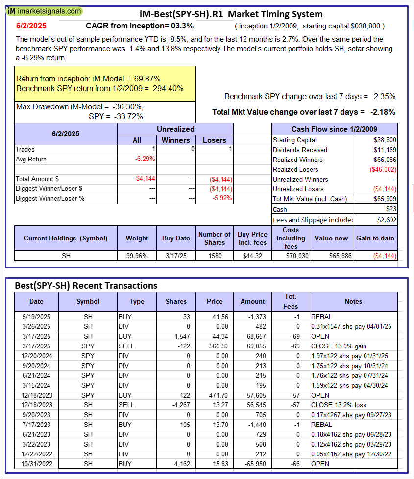 iM-Best(SPY-SH).R1: The model’s out of sample performance YTD is -8.5%, and for the last 12 months is 2.7%. Over the same period the benchmark SPY performance was 1.4% and 13.8% respectively. Over the previous week the market value of Best(SPY-SH) gained -2.18% at a time when SPY gained 2.35%. A starting capital of $100,000 at inception on 1/2/2009 would have grown to $65,909 which includes $23 cash and excludes $2,692 spent on fees and slippage. |