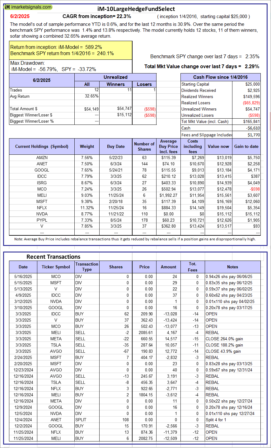 iM-10LargeHedgeFundSelect: Since inception, on 1/5/2016, the model gained 589.16% while the benchmark SPY gained 240.07% over the same period. Over the previous week the market value of iM-10LargeHedgeFundSelect gained 2.29% at a time when SPY gained 2.35%. A starting capital of $25,000 at inception on 1/5/2016 would have grown to $165,841 which includes -$6,610 cash and excludes $1,770 spent on fees and slippage.