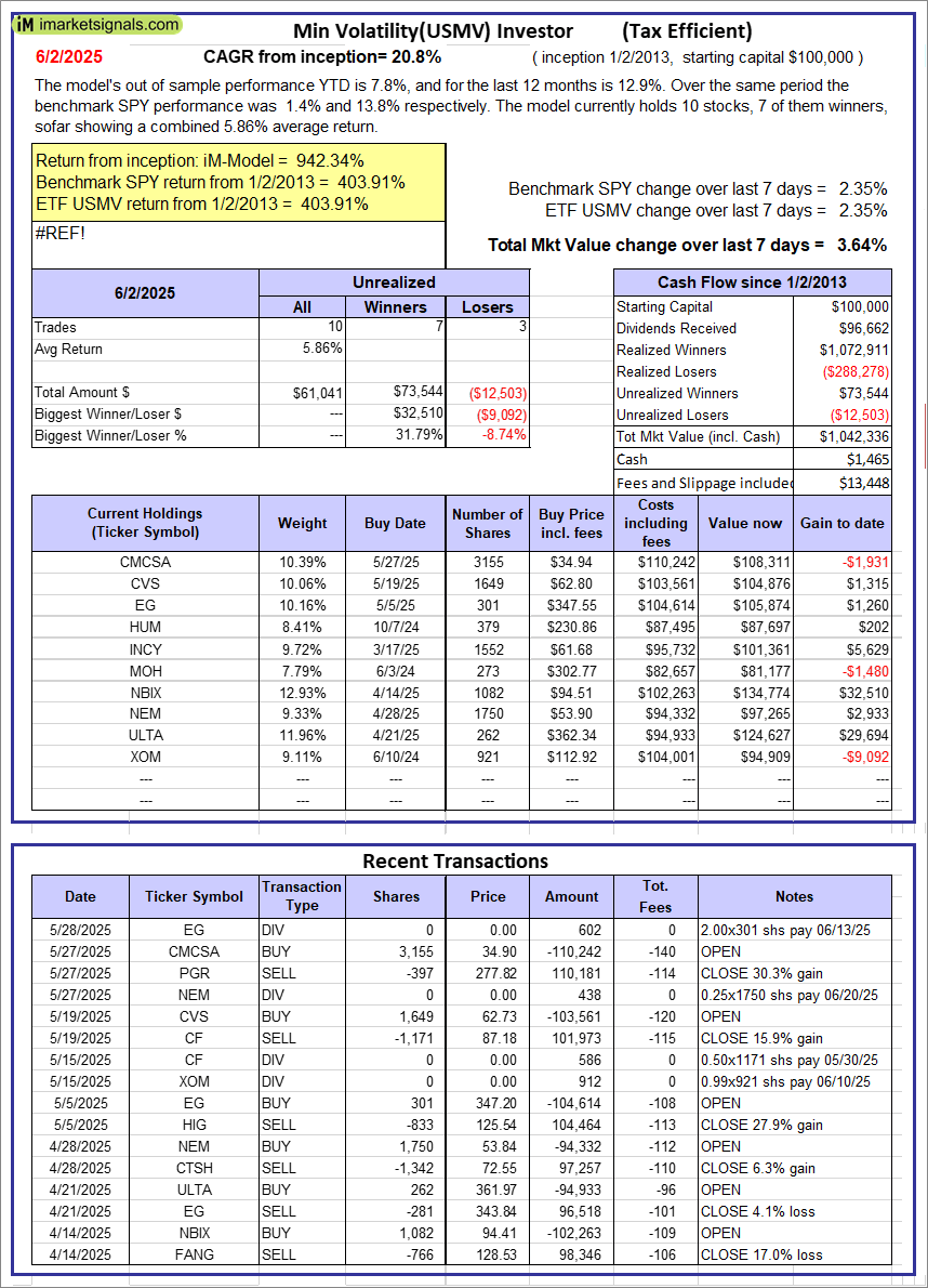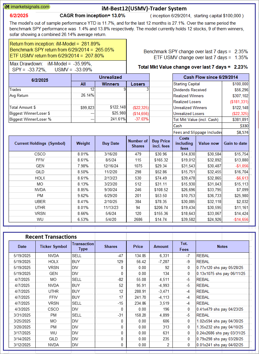 iM-Best12(USMV)-Trader: The model’s out of sample performance YTD is 11.7%, and for the last 12 months is 27.1%. Over the same period the benchmark SPY performance was 1.4% and 13.8% respectively. Since inception, on 6/30/2014, the model gained 281.89% while the benchmark SPY gained 265.05% and the ETF USMV gained 207.80% over the same period. Over the previous week the market value of iM-Best12(USMV)-Trader gained 2.23% at a time when SPY gained 2.35%. A starting capital of $100,000 at inception on 6/30/2014 would have grown to $381,891 which includes $330 cash and excludes $8,574 spent on fees and slippage.