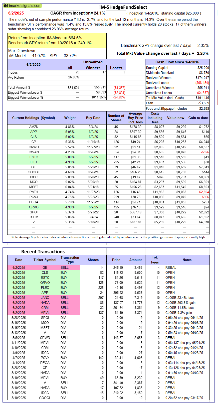 iM-5HedgeFundSelect: Since inception, on 1/5/2016, the model gained 664.59% while the benchmark SPY gained 240.07% over the same period. Over the previous week the market value of iM-5HedgeFundSelect gained 2.20% at a time when SPY gained 2.35%. A starting capital of $25,000 at inception on 1/5/2016 would have grown to $191,146 which includes -$3,559 cash and excludes $2,655 spent on fees and slippage.