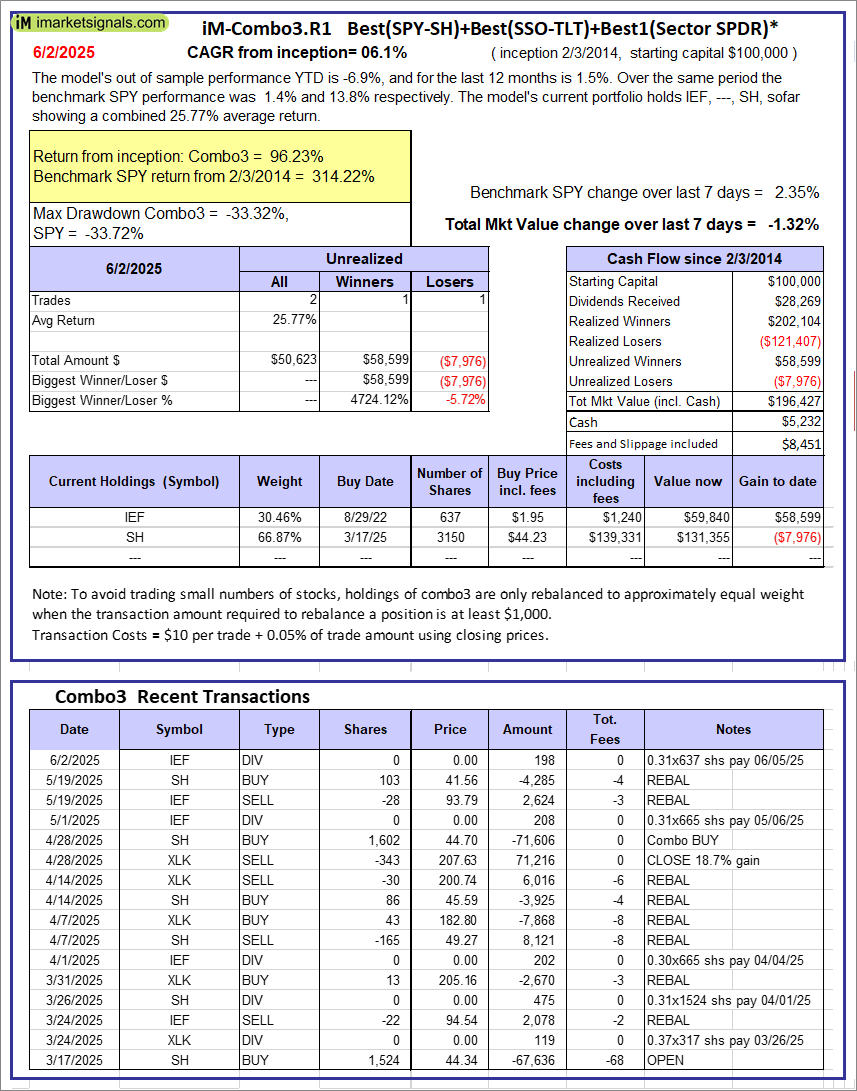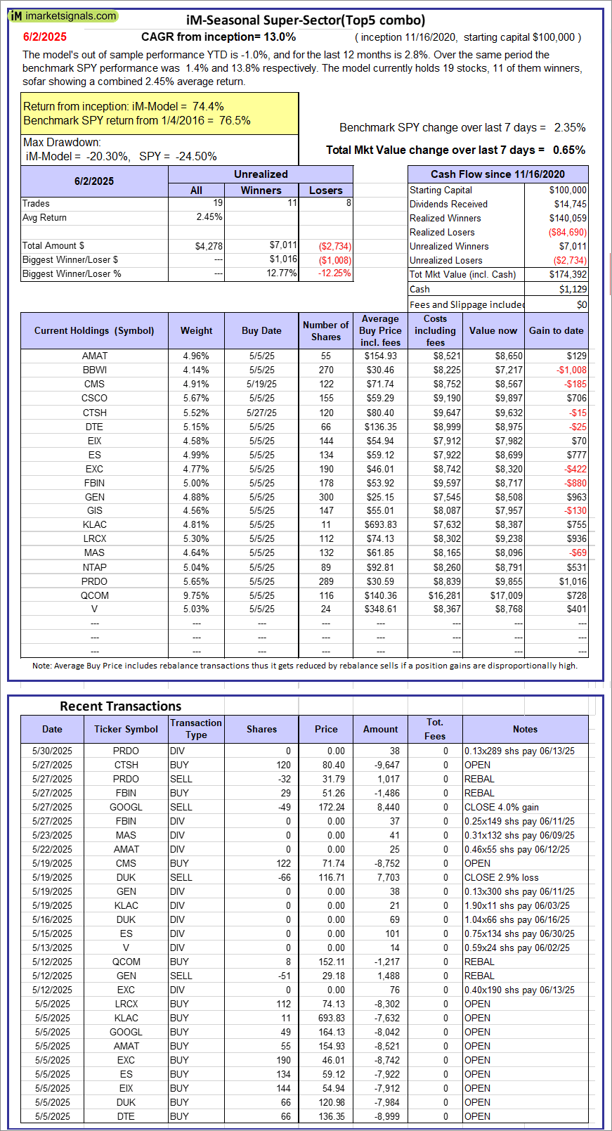 iM-Seasonal Super-Sectors (Top5 combo) : Since inception, on 11/17/2020, the model gained 74.39% while the benchmark SPY gained 76.53% over the same period. Over the previous week the market value of iM-Seasonal Super-Sectors (Top5 combo) gained 0.65% at a time when SPY gained 2.35%. A starting capital of $100,000 at inception on 11/17/2020 would have grown to $174,392 which includes $1,129 cash and excludes $00 spent on fees and slippage. |