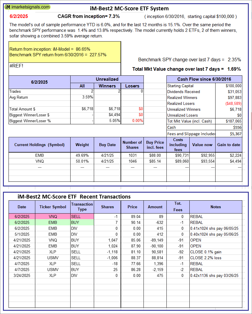 iM-Best2 MC-Score ETF System: The model’s out of sample performance YTD is 6.0%, and for the last 12 months is 15.1%. Over the same period the benchmark SPY performance was 1.4% and 13.8% respectively. Over the previous week the market value of the iM-Best2 MC-Score ETF System gained 1.69% at a time when SPY gained 2.35%. A starting capital of $100,000 at inception on 6/30/2016 would have grown to $187,065 which includes $556 cash and excludes $5,367 spent on fees and slippage. |