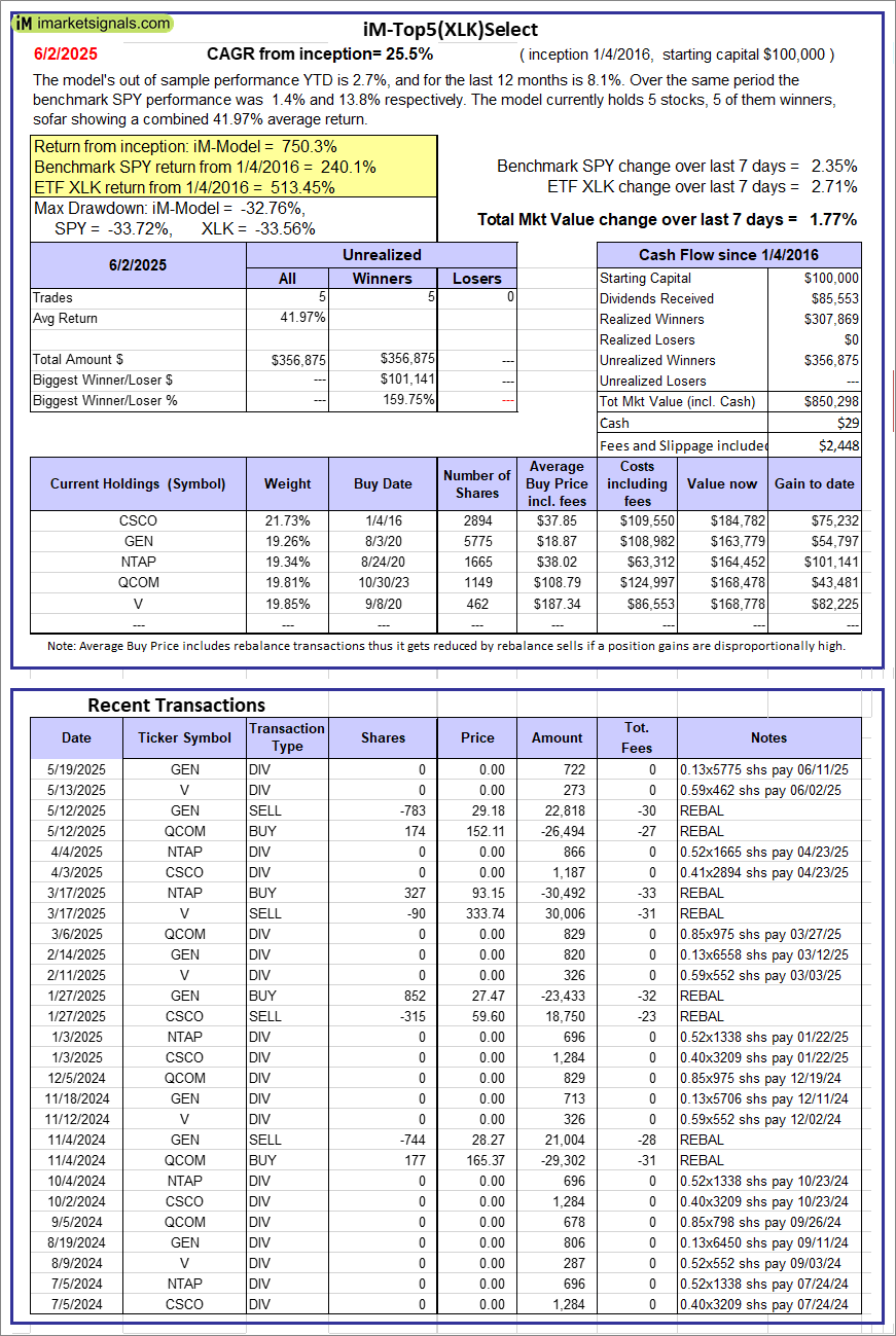 iM-Top5(XLK)Select: Since inception, on 1/5/2016, the model gained 750.30% while the benchmark SPY gained 240.07% over the same period. Over the previous week the market value of iM-Top5(XLK)Select gained 1.77% at a time when SPY gained 2.35%. A starting capital of $100,000 at inception on 1/5/2016 would have grown to $850,298 which includes $29 cash and excludes $2,448 spent on fees and slippage. |