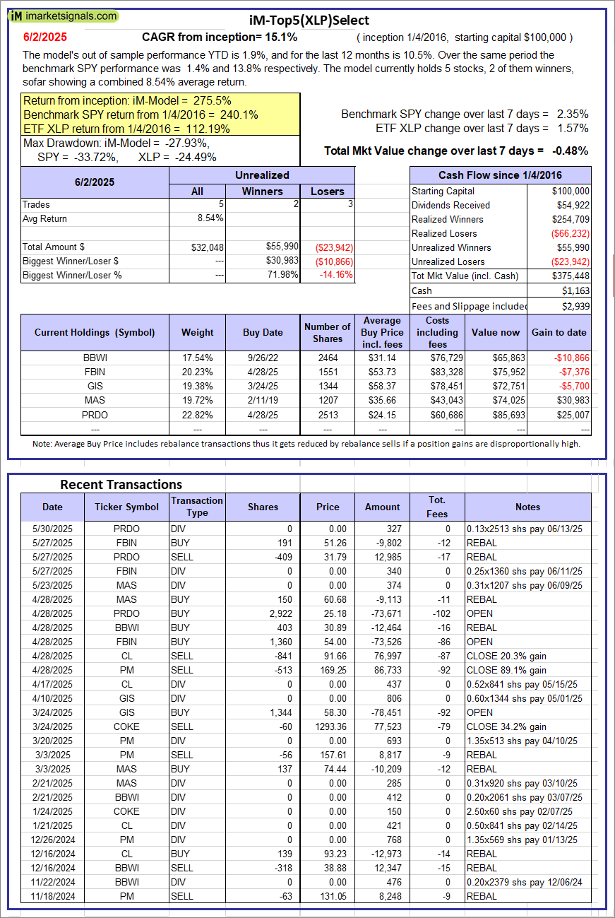 iM-Top5(XLP)Select: Since inception, on 1/5/2016, the model gained 275.45% while the benchmark SPY gained 240.07% over the same period. Over the previous week the market value of iM-Top5(XLP)Select gained -0.48% at a time when SPY gained 2.35%. A starting capital of $100,000 at inception on 1/5/2016 would have grown to $375,448 which includes $1,163 cash and excludes $2,939 spent on fees and slippage. |