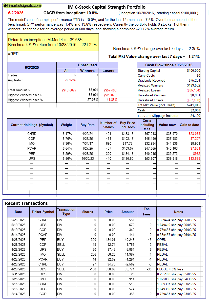 iM 6-Stock Capital Strength Portfolio: The model’s out of sample performance YTD is -10.0%, and for the last 12 months is -7.5%. Over the same period the benchmark SPY performance was 1.4% and 13.8% respectively. Over the previous week the market value of the iM 6-Stock Capital Strength Portfolio gained 1.21% at a time when SPY gained 2.35%. A starting capital of $100,000 at inception on 10/28/2016 would have grown to $241,045 which includes $2,963 cash and excludes $4,109 spent on fees and slippage.