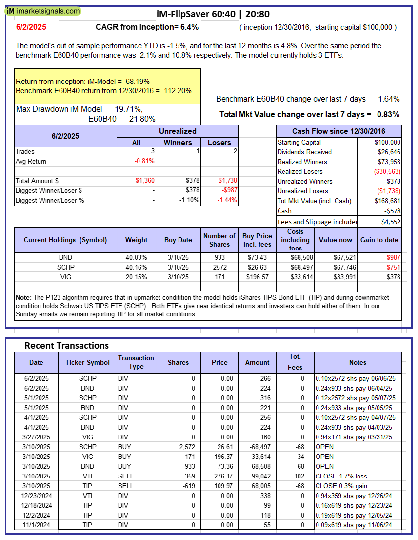iM-Inflation Attuned Multi-Model Market Timer: The model’s out of sample performance YTD is 8.7%, and for the last 12 months is 6.5%. Over the same period the benchmark SPY performance was 1.4% and 13.8% respectively. Over the previous week the market value of the iM-Inflation Attuned Multi-Model Market Timer gained -0.18% at a time when SPY gained 2.35%. A starting capital of $100,000 at inception on 3/24/2017 would have grown to $134,364,976 which includes $2,001,710 cash and excludes $3,820,720 spent on fees and slippage.