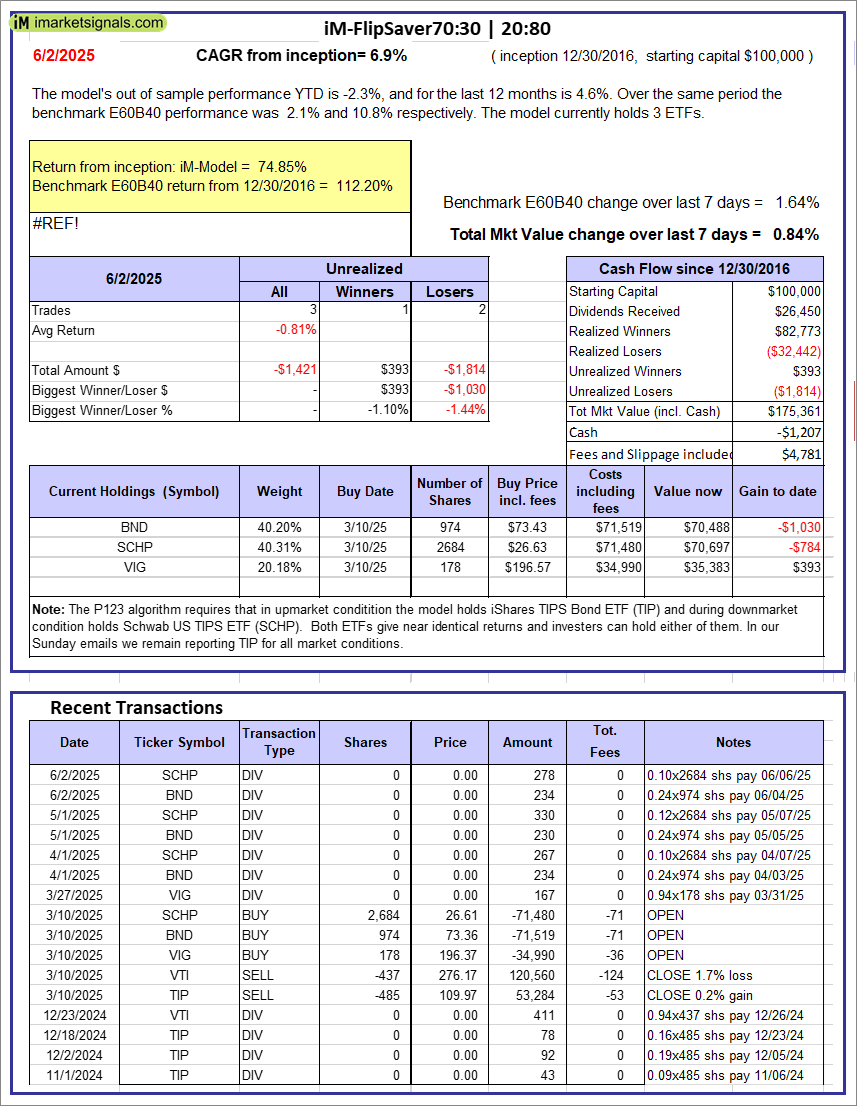 iM-Composite (SPY-IEF) Timer: The model’s out of sample performance YTD is -4.5%, and for the last 12 months is 3.6%. Over the same period the benchmark SPY performance was 1.4% and 13.8% respectively. Over the previous week the market value of the iM-Composite (SPY-IEF) Timer gained 0.53% at a time when SPY gained 2.35%. A starting capital of $100,000 at inception on 6/30/2016 would have grown to $205,557 which includes -$4,587 cash and excludes $7,366 spent on fees and slippage.