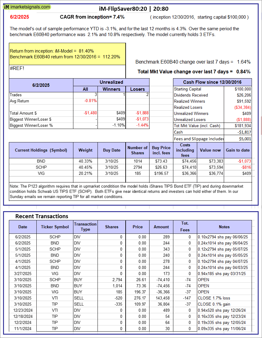 iM-FlipSaver 80:20 | 20:80 – 2017: The model’s out of sample performance YTD is -3.1%, and for the last 12 months is 4.3%. Over the same period the benchmark E60B40 performance was 2.1% and 10.8% respectively. Over the previous week the market value of iM-FlipSaver 80:20 | 20:80 gained 0.84% at a time when SPY gained 1.64%. A starting capital of $100,000 at inception on 1/2/2017 would have grown to $181,934 which includes -$1,817 cash and excludes $5,001 spent on fees and slippage.