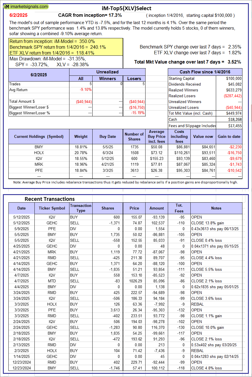 iM-Top5(XLV)Select: Since inception, on 1/5/2016, the model gained 349.97% while the benchmark SPY gained 240.07% over the same period. Over the previous week the market value of iM-Top5(XLV)Select gained 3.52% at a time when SPY gained 2.35%. A starting capital of $100,000 at inception on 1/5/2016 would have grown to $449,974 which includes $18,268 cash and excludes $17,455 spent on fees and slippage. |