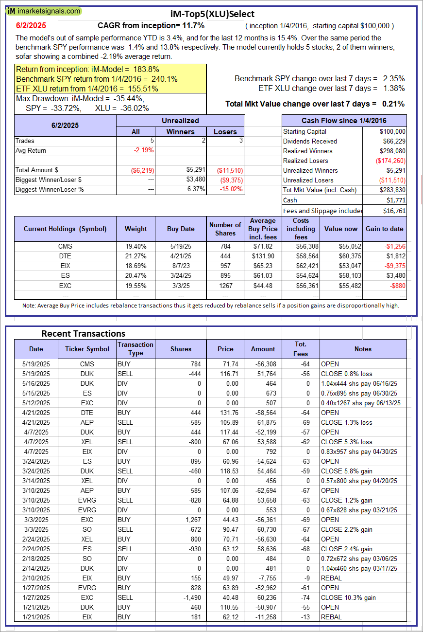 iM-Top5(XLU)Select: Since inception, on 1/5/2016, the model gained 183.83% while the benchmark SPY gained 240.07% over the same period. Over the previous week the market value of iM-Top5(XLU)Select gained 0.21% at a time when SPY gained 2.35%. A starting capital of $100,000 at inception on 1/5/2016 would have grown to $283,830 which includes $1,771 cash and excludes $16,761 spent on fees and slippage. |