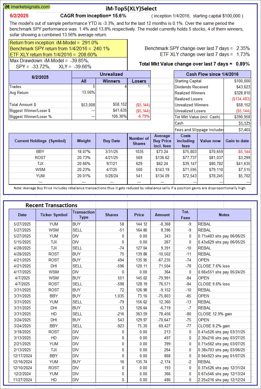 iM-Top5(XLY)Select: Since inception, on 1/5/2016, the model gained 290.96% while the benchmark SPY gained 240.07% over the same period. Over the previous week the market value of iM-Top5(XLY)Select gained 0.89% at a time when SPY gained 2.35%. A starting capital of $100,000 at inception on 1/5/2016 would have grown to $390,958 which includes $1,125 cash and excludes $7,401 spent on fees and slippage. |