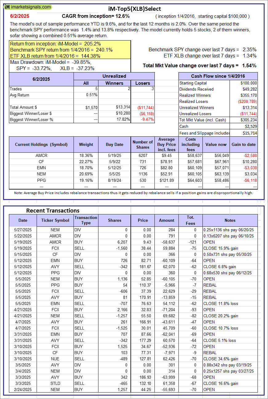 iM-Top5(XLB)Select: Since inception, on 1/5/2016, the model gained 205.23% while the benchmark SPY gained 240.07% over the same period. Over the previous week the market value of iM-Top5(XLB)Select gained 1.54% at a time when SPY gained 2.35%. A starting capital of $100,000 at inception on 1/5/2016 would have grown to $305,234 which includes $2,529 cash and excludes $15,714 spent on fees and slippage. |