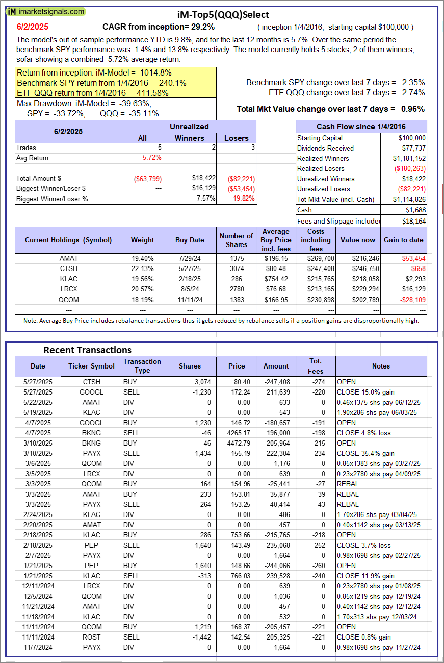 iM-Top5(QQQ)Select: Since inception, on 1/5/2016, the model gained 1014.83% while the benchmark SPY gained 240.07% over the same period. Over the previous week the market value of iM-Top5(QQQ)Select gained 0.96% at a time when SPY gained 2.35%. A starting capital of $100,000 at inception on 1/5/2016 would have grown to $1,114,826 which includes $1,688 cash and excludes $18,164 spent on fees and slippage. |