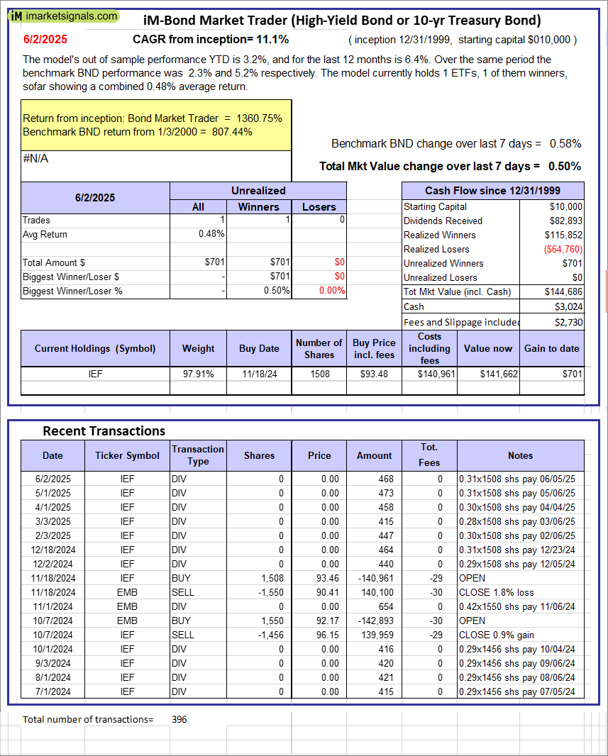 iM-Bond Market Trader (High-Yield Bond or 10-yr Treasury Bond): The model’s out of sample performance YTD is 3.2%, and for the last 12 months is 6.4%. Over the same period the benchmark BND performance was 2.3% and 5.2% respectively. Over the previous week the market value of the iM-Bond Market Trader (High-Yield Bond or 10-yr Treasury Bond) gained 0.50% at a time when BND gained 0.58%. A starting capital of $10,000 at inception on 1/3/2000 would have grown to $144,686 which includes $3,024 cash and excludes $2,730 spent on fees and slippage.