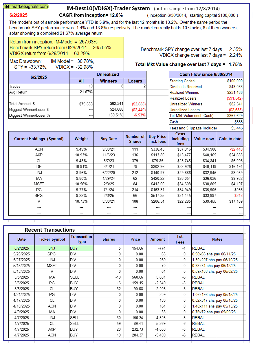 iM-Best10(VDIGX)-Trader: The model’s out of sample performance YTD is 5.8%, and for the last 12 months is 13.2%. Over the same period the benchmark SPY performance was 1.4% and 13.8% respectively. Since inception, on 7/1/2014, the model gained 267.63% while the benchmark SPY gained 265.05% and VDIGX gained 63.29% over the same period. Over the previous week the market value of iM-Best10(VDIGX) gained 1.75% at a time when SPY gained 2.35%. A starting capital of $100,000 at inception on 7/1/2014 would have grown to $367,629 which includes $555 cash and excludes $5,445 spent on fees and slippage.
